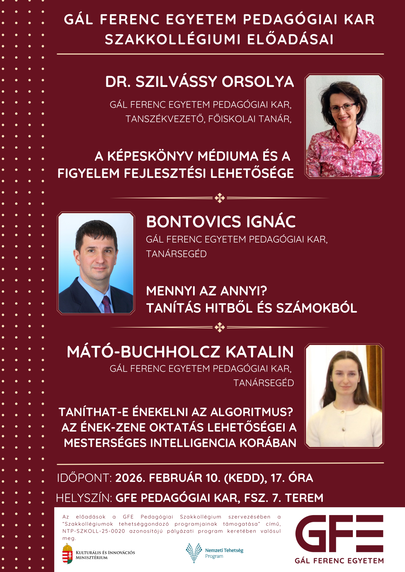 2026. február 10-én a Pedagógiai Kar három oktatója, Dr. Szilvássy Orsolya, Bontovics Ignác, és Mátó-Buchholcz Katalin tart érdekesnek ígérkező előadást.