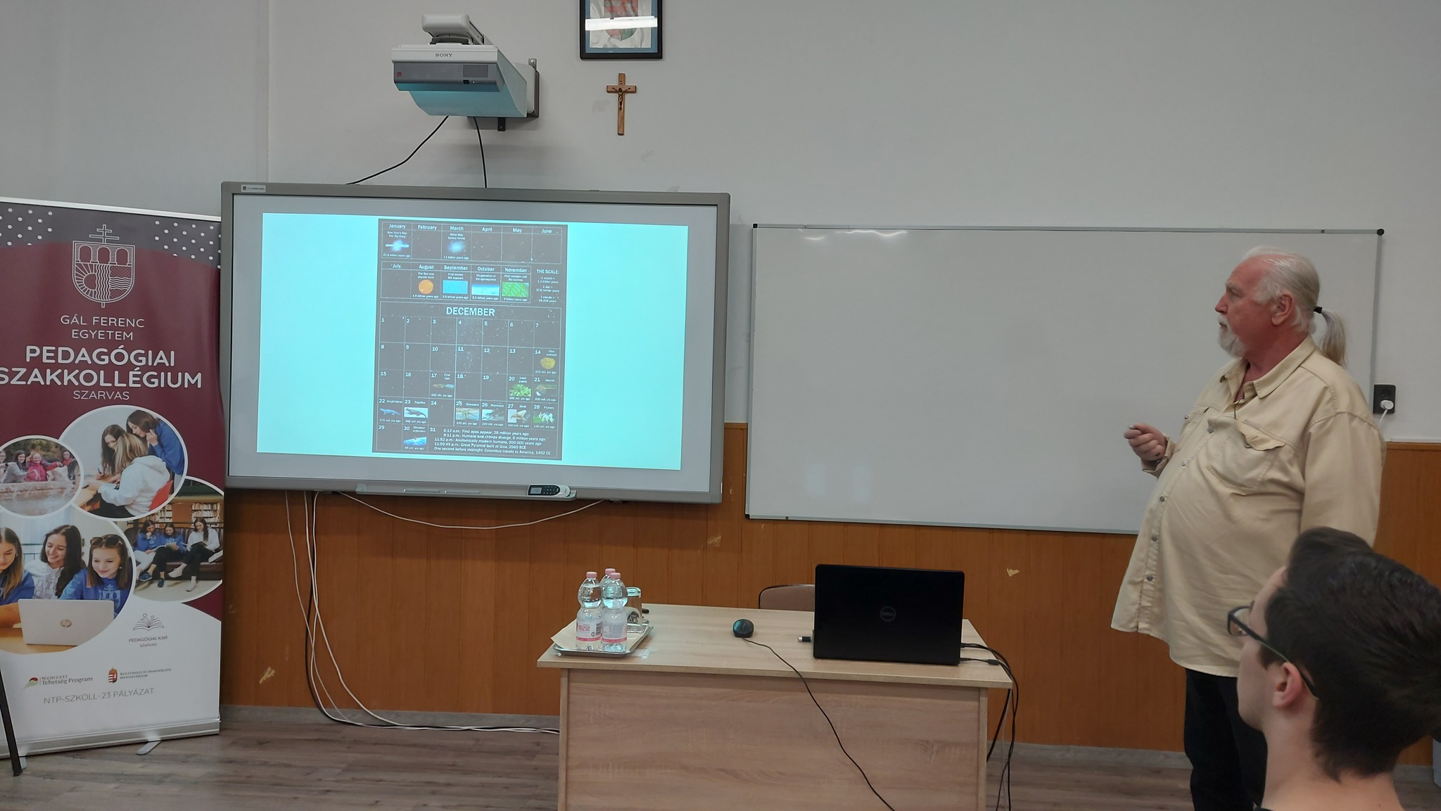 Dr. Soós István f. docens előadása az univerzum történetének távlataiból indított. Egy szemléletes példával rávilágított: ha a világmindenség 13,8 milliárd évét egyetlen naptári évbe sűrítenénk, az emberiség teljes történelme mindössze az utolsó 15 másodpercet foglalná el.