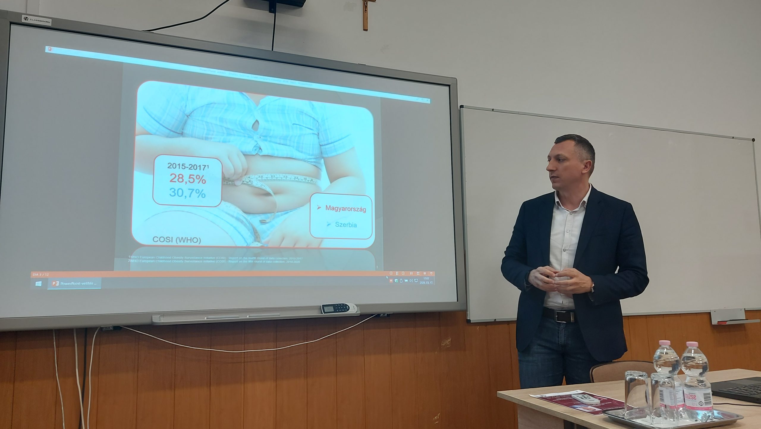 Az előadó rávilágított a gyermekkori elhízás aggasztó nemzetközi és hazai adataira, ugyanakkor hangsúlyozta az oktatási intézmények kulcsszerepét a folyamat megfordításában. A bemutatott adatok szerint Magyarországon a mindennapos testnevelés bevezetése (heti 5 óra) kiemelkedő az Európai Unióban, ahol az átlag csupán heti 2-3 óra. A legfrissebb kutatási eredmények (COSI 2022-2024) biztató tendenciát mutatnak: a magyarországi 6-9 éves korosztályban csökkent a túlsúlyos és elhízott gyermekek aránya.